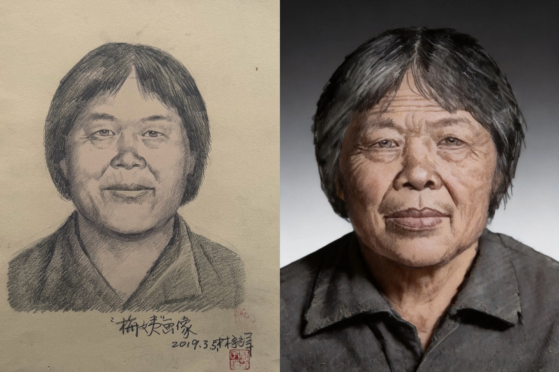 林宇辉画图的“梅姨”模拟画像(左为2019年“一画”版块,右为2026年“三画”版块)。
