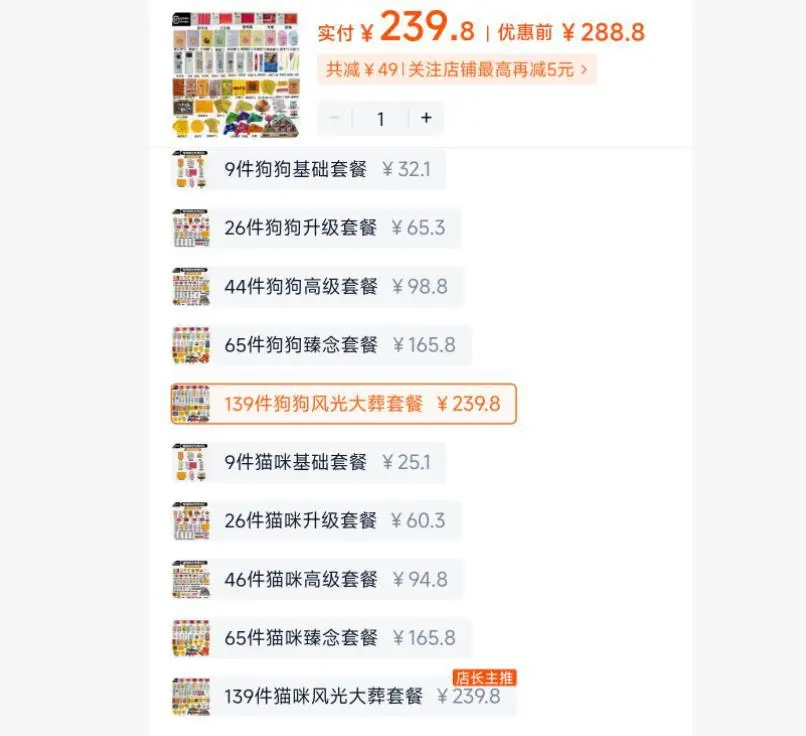 记者在某电商平台上以“宠物冥币”“宠物祭祀用品”为要道词进行搜索,发现存稠密店铺正售卖宠物祭祀用品,品类稠密,从宠物普通的食品、衣物再到住所,可谓应有尽有,与践诺糊口着实逐一双应。记者严防到,有店铺分解全网已有2万+东谈主付款。还有店铺售卖的“139件狗狗快意大葬套餐”祭祀品价钱为239.8元,其中包含送钱表文、洗发水、洗衣机、空调,以致伴有“仆东谈主及伴宠”,以及金条银条等祭祀品。
