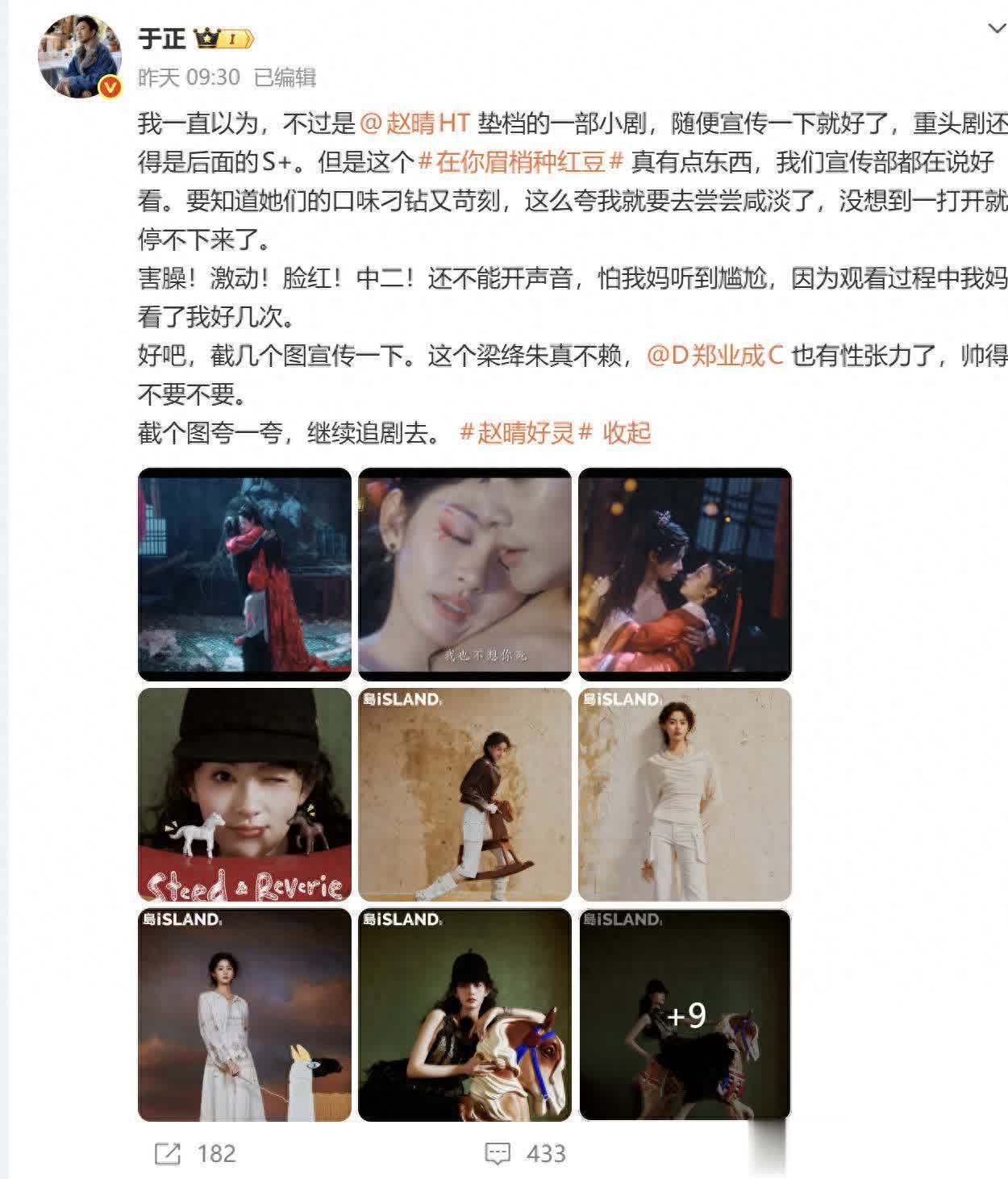 郑业成和赵晴主演的新剧《在你眉梢种红豆》开播后,依照常规,于正又启动为自家艺东说念主赵晴宣传。