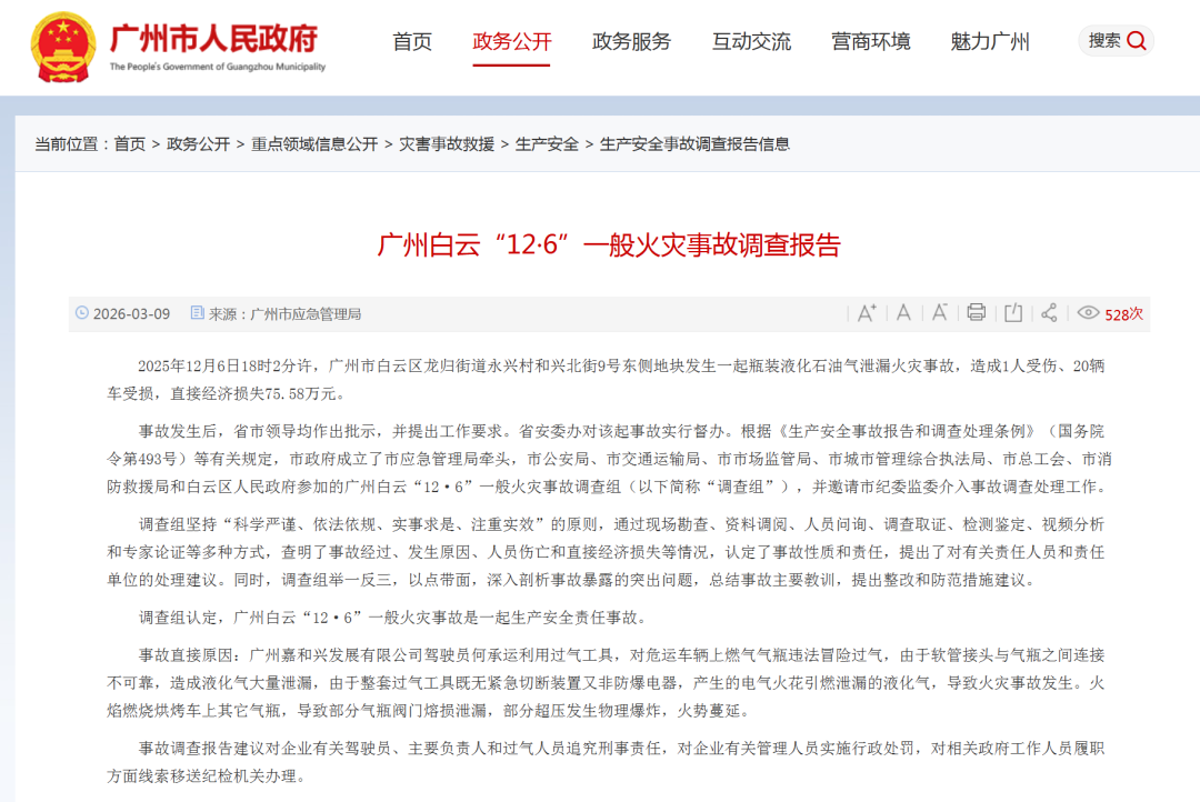 2025年12月6日16时42分,广州市嘉和兴发展有限公司危运车辆驾驶员何承运,在押运员彭伟提前下车回家的情况下,独自驾驶装载燃气的粤A7C8U5号牌厢式危运车辆,投入白云区龙归街永兴村泊车闸口内和兴北街9号东侧地块,停放在场面东侧无为车辆之间的一个空位。随后,何承运赶赴隔壁家中,用电动三轮车装载过气器用(1个倒气泵、2条一语气软管、1个蓄电板)和1个15公斤空瓶回到涉事地方。