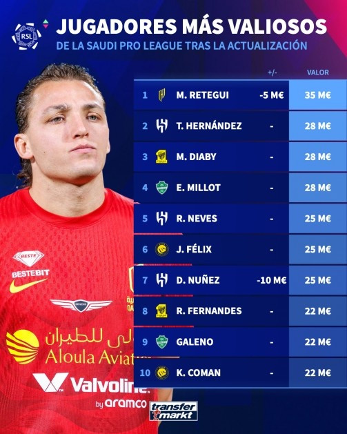 开云体育(kaiyun)官方网站 沙特联赛球员身价排行: 雷特吉3500万欧居首, 努涅斯暴跌1000万欧