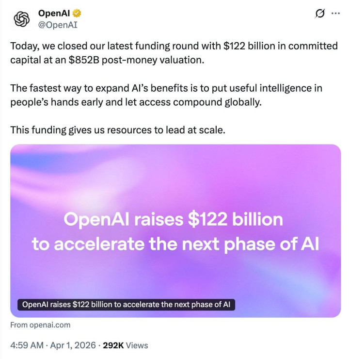 智东西4月1日音书,今早,OpenAI文书完成了最新一轮融资,召募资金达1220亿好意思元(约合东谈主民币8416.78亿元),投后估值达8520亿好意思元(约合东谈主民币58779.48亿元),成为各人有史以来规模最大的单笔私募股权融资。